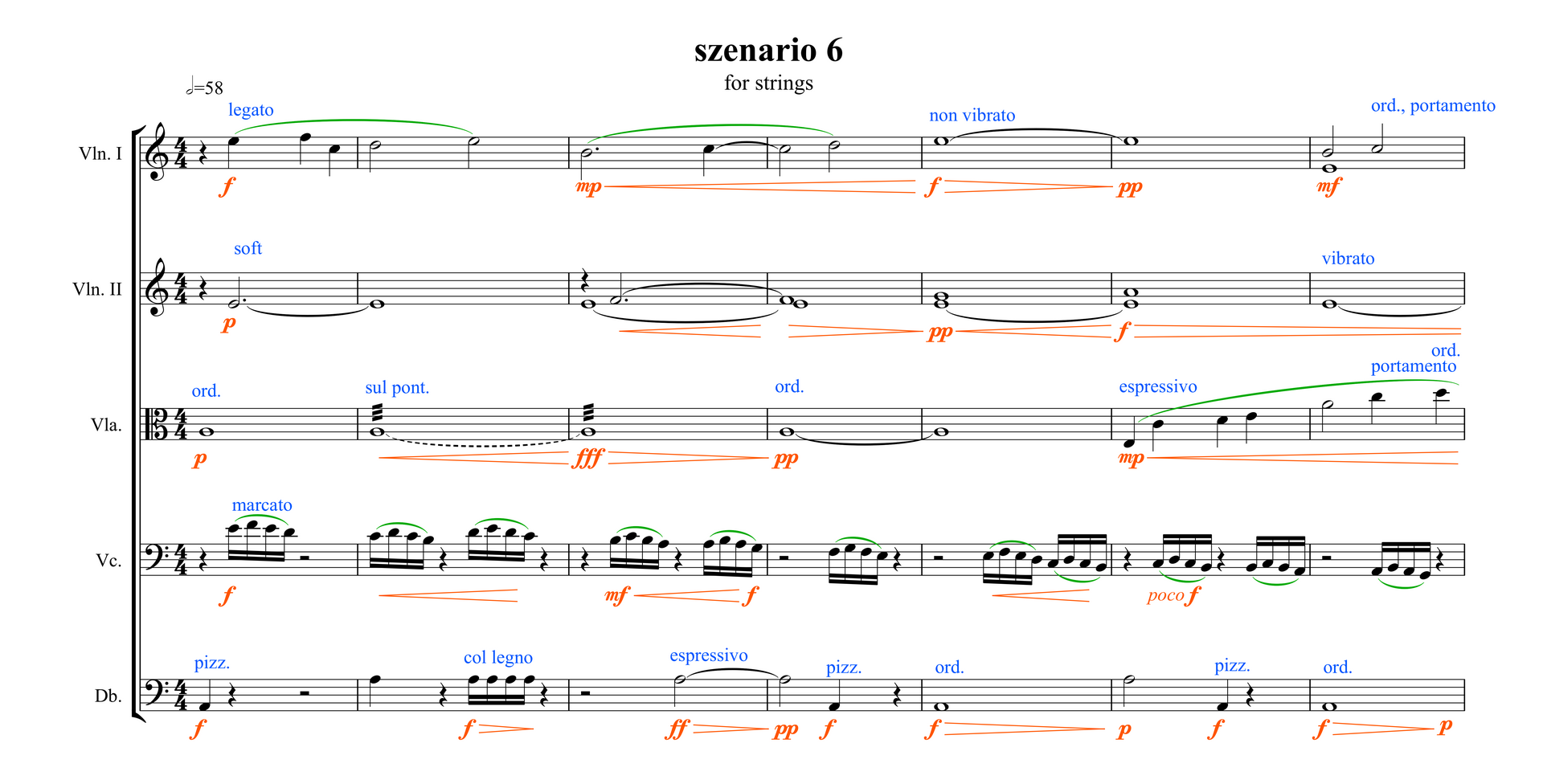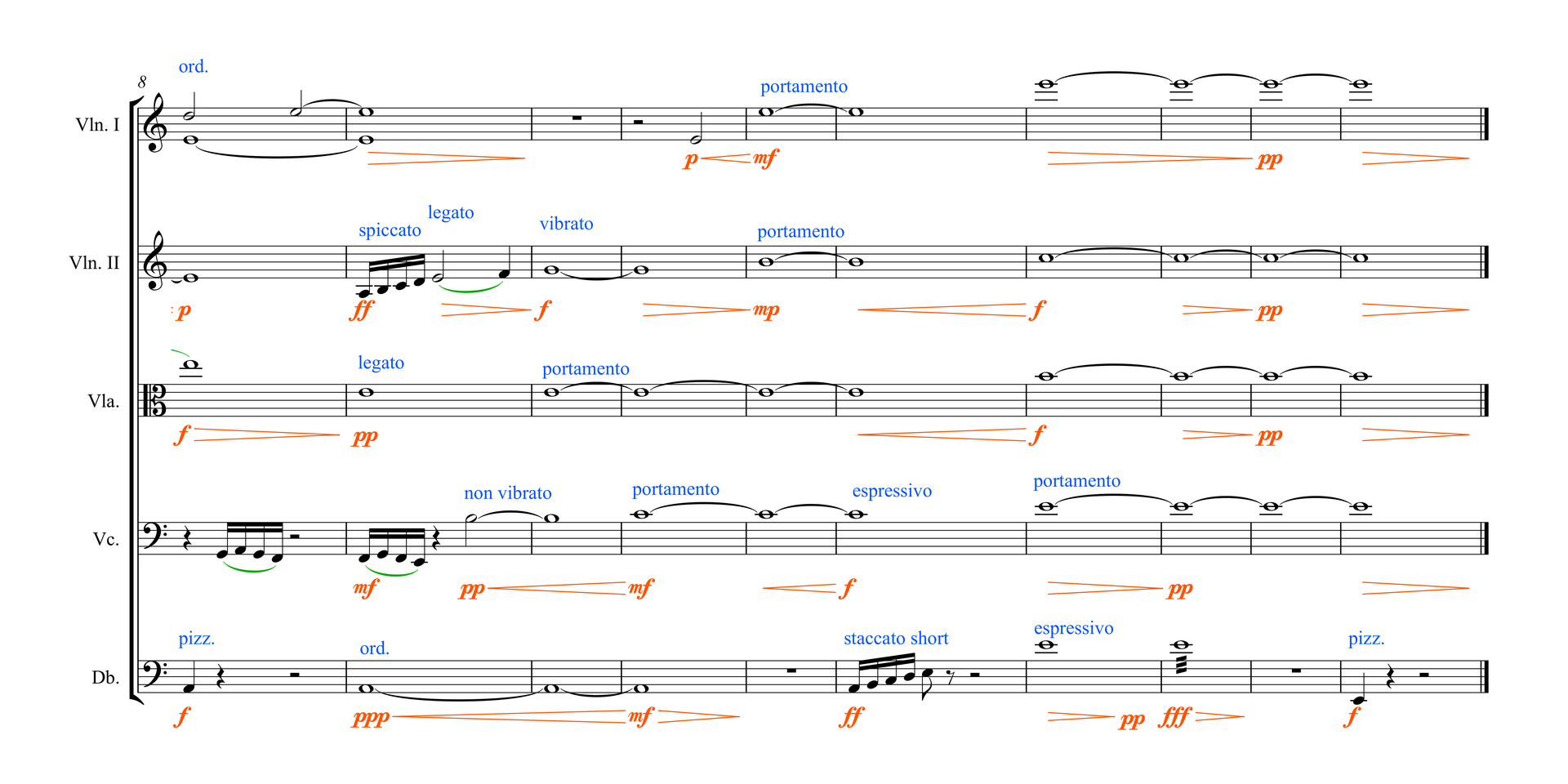 In der folgenden Übersicht sind die musikalischen Parameter, die dem Notenbild hinzugefügt wurden, um die entsprechenden Klangeffekte auszulösen, nach den Kategorien Dynamik, Artikulation, Technique Text und Legatobögen farblich markiert. Zusätzlich erscheint eine Darstellung der Automationskurven für den MIDI-Controller „Expression“.